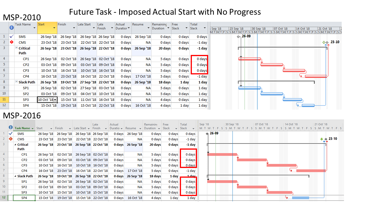 The impacts of out-of-sequence progress on the Total Slack of some tasks are the result of specific decisions in MSP’s backward-pass algorithms for computing Late dates and Total Slack. Obviously, the algorithm has been tweaked between MSP 2010 and MSP 2016 leading to the even more undesired results.